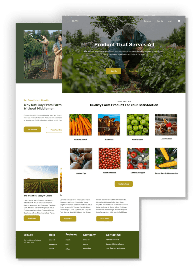 This farm website connects farmers and end users directly, without the need for middlemen. The design focuses on creating an immersive and engaging experience for users, highlighting the benefits of buying directly from local farmers. The layout is clean and modern, with a clear emphasis on showcasing the products and services offered by Obifarm.
